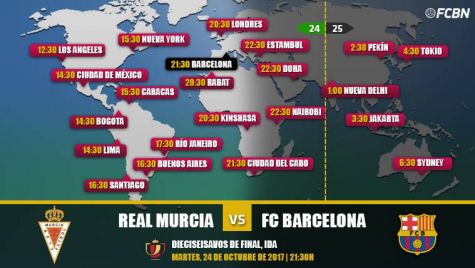 Fútbol Club Barcelona y Real Murcia se enfrentan en el Estadio Nueva Condomina, el martes 24 de octubre a las 21:30 horas. El encuentro corresponde a la ida de dieciseisavos de final de la Copa del Rey de Fútbol 2017-2018.