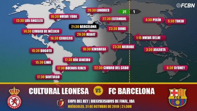 En Sudamérica, Centroamérica, Caribe, México y Brasil, el partido Cultural Leonesa contra Barcelona podrá verse en vivo a través de los siguientes horarios y canales de televisión: beIN SPORTS y DIRECTV Sports.