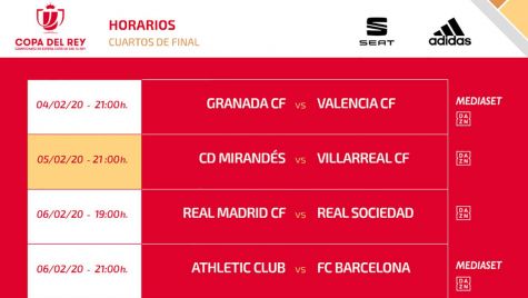 El Real Madrid, precisamente, se verá las caras con la Real Sociedad el jueves 6 a las 19:00, solo dos horas antes que el Barça-Athletic. El Granada y el Valencia abrirán estos cuartos de final el martes 4 a las 21:00 horas en el Nuevo Los Cármenes y, por último, el Mirandés y el Villarreal jugarán el miércoles 5 a las 21:00 en Anduva.