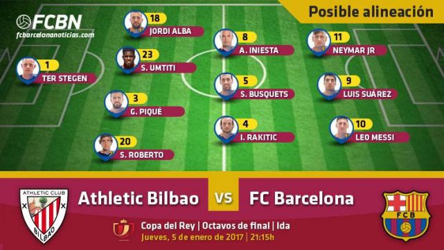 El FC Barcelona afronta este jueves la ida de los octavos de final de Copa del Rey 2016-17 contra el Athletic de Bilbao en San Mamés. Con el objetivo de decantar la eliminatoria, se prevé que Luis Enrique alinee a los mejores