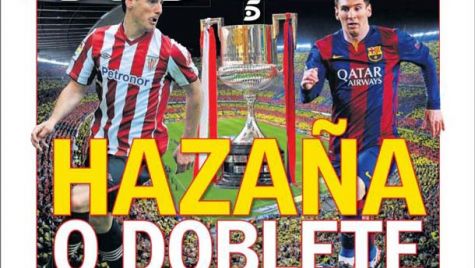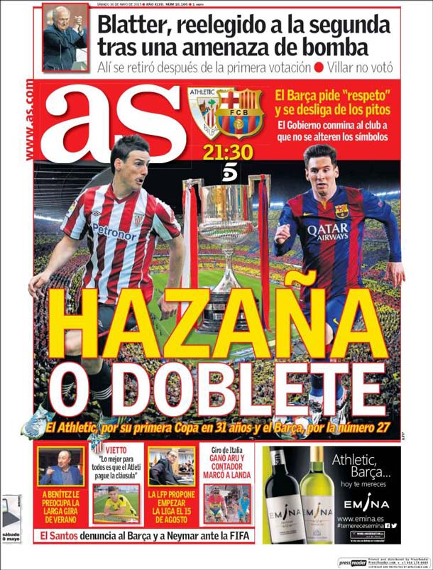 Portada del periódico As, sábado 30 de mayo de 2015. El Athletic, por su primera Copa en 31 años y el Barça, por la número 27. El Barça pide respeto y se desliga de los pitos.