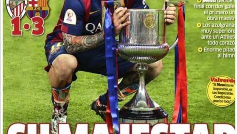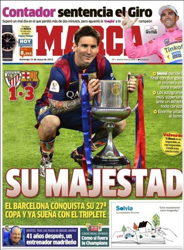 Portada del periódico Marca, domingo 31 de mayo de 2015. El Barcelona conquista su 27ª Copa y ya sueña con el triplete. Messi decide la final con dos goles, el primero una obra maestra.
