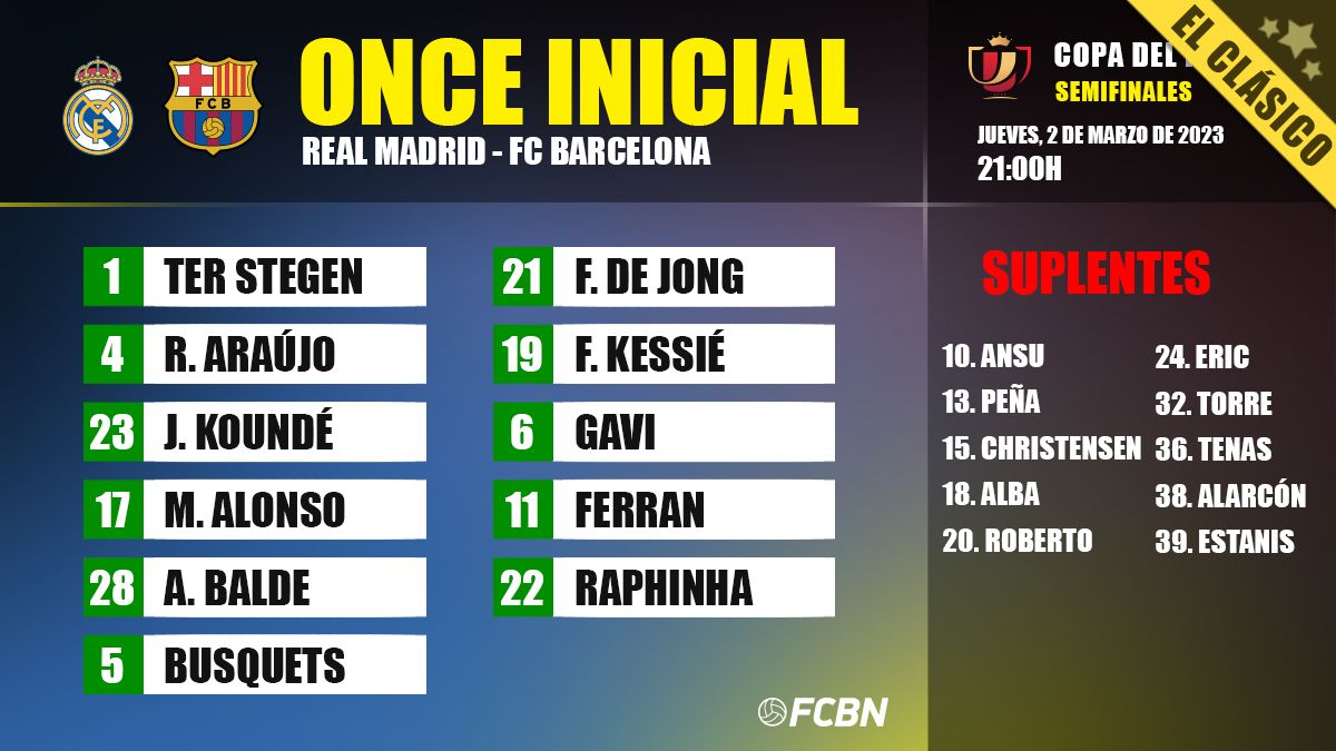 - XI del FC Barcelona: Ter Stegen; Araújo, Koundé, Alonso, Balde; Busquets, De Jong, Kessié, Gavi; Ferran y Raphinha.