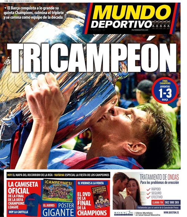 Cover of the periodic Sportive World, Sunday 7 June 2015. The Barça conquers to the big his fifth Champions, culminates the triplete and tops like team of the decade.
