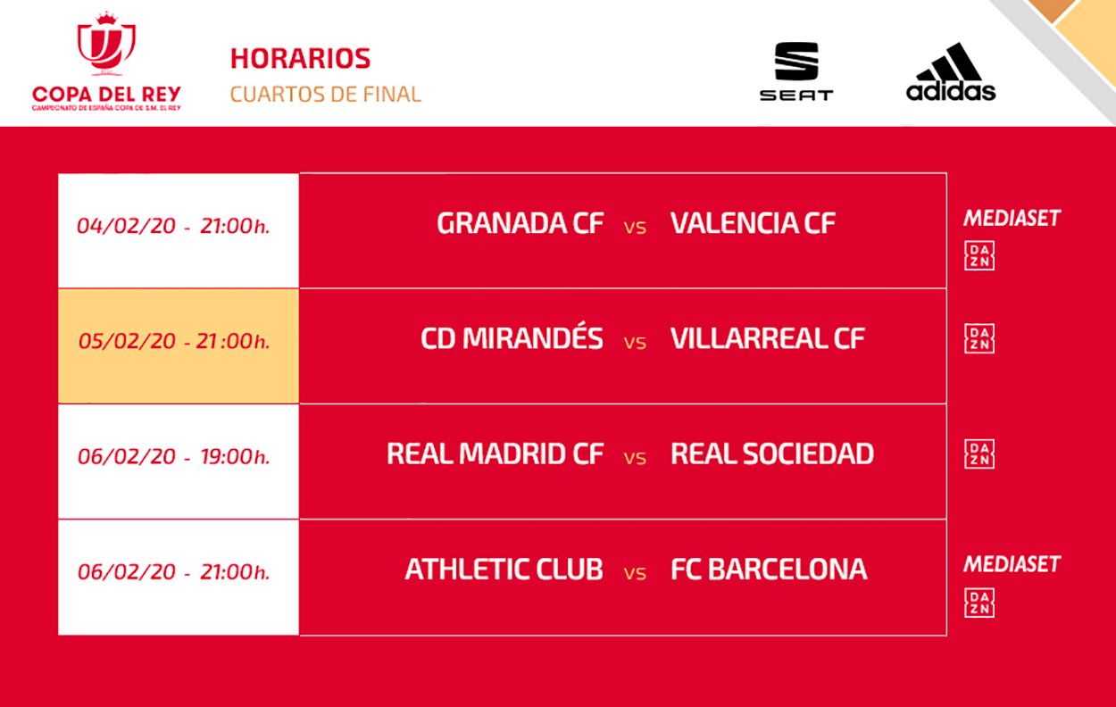 The Real Madrid, precisely, will see the faces with the Real Sociedad the Thursday 6 to the 19:00, only two hours before that the Barça-Athletic. The Granada and Valencia will open these quarter-finals the Tuesday 4 to the 21:00 hours in the New The Cármenes and, finally, the Mirandés and the Villarreal will play the Wednesday 5 to the 21:00 in Anduva.