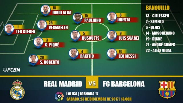 Last party of the year 2017 for Barça and Real Madrid with the dispute of a Classical in the Bernabéu. The Barcelona have the opportunity to shoot in the classification, but for this have to give a hit home of his rival maximum. These are the elected