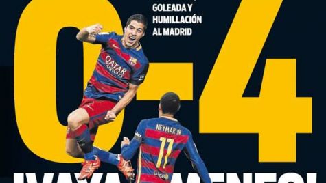 Cover of the newspaper Sport, Sunday 22 November 2015. Partidazo, goleada and humiliation to the Madrid. The goals of Suárez (2), Neymar and Iniesta pop the Bernabéu and put to the Barça leader with 6 points of advantage. The white fans sacked to the team with pañolada and cries of "Florentino resignation!"