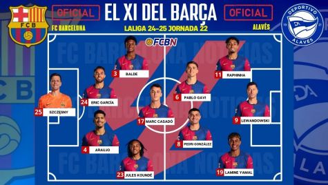 OFFICIAL: The starting lineups of FC Barcelona under Hansi Flick and Alavés under Eduardo Coudet for the match of matchday 22 of LaLiga 2024/25 is now confirmed.