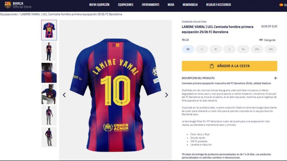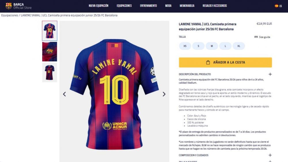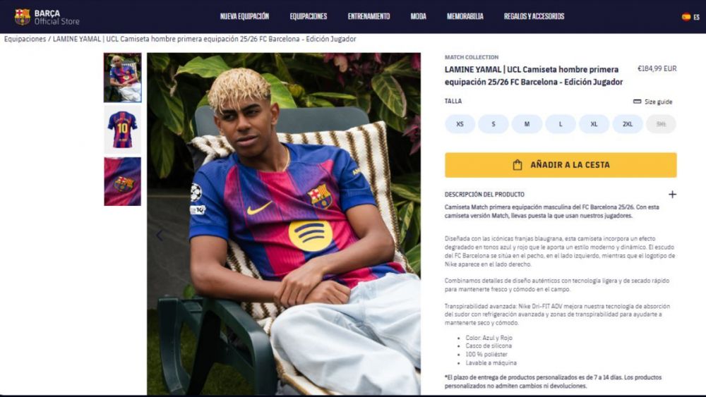 In this sense, the new Lamine Yamal jersey with the number '10' is now available on the club's website, as well as in the Barça Botiga. A garment that, depending on the choice, varies in price, with the most expensive being the 'match' version, with the same quality as the one worn by the players in official matches, and which has a price of 184.99 euros.
