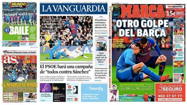 - Mark: "The classical triumph of the Barça" and "Another hit of the Barça" were some of the headlines that published the newspaper 'Mark', first in his on-line version and hours afterwards in paper. "Faithful to his habit, the Barça went back to impose in the Bernabéu. It did it of distinct form to the Glass, more faithful to his style, dominating the game, imposing the touch to the white heart. At all it can reproach to the Madrid, that tried it from beginning to end, but that has fallen in the melancholy. The Barcelona deleted definitively to the whites of the League with Messi governing with the ball and Hammered without her", are some of the lines that can read in the Spanish newspaper.