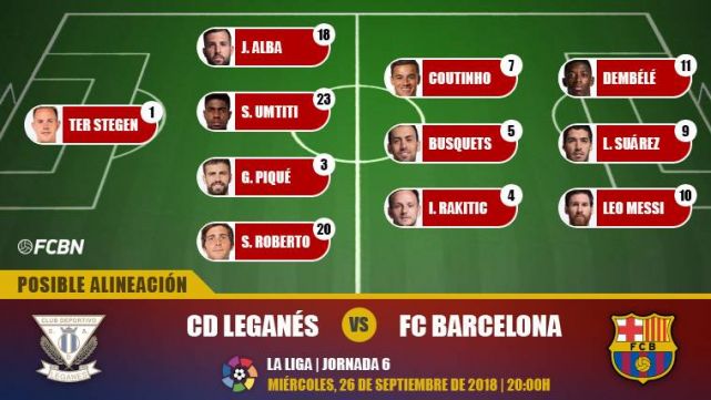 The FC Barcelona confronts to the Leganés this Wednesday in Butarque, with reason of the sixth day of LaLiga Santander 2018-19. These are the possible alignments that could present both teams of face to the meeting