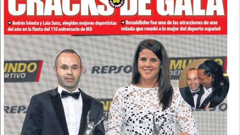 Cover of the periodic Sportive World, Tuesday 2 February 2016. Andrés Iniesta and Laia Sanz, better elected sportsmen of the year in the party of the 110 anniversary of MD. Ronaldinho Was one of the attractions of a watched that gathered probably of the Spanish sport.