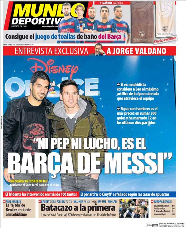 Cover of the periodic Sportive World, Friday 19 February 2016. Jorge Valdano considers to Leo the maximum artífice of the golden age that crosses the team. It follows with hunger: it is the most precocious in adding 300 goals and has marked 12 in the last ten parties.
