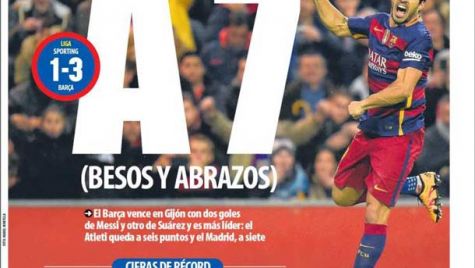 Cover of the periodic Sportive World, Thursday 18 February 2016. The Barça wins in Gijón with two goals of Messi and another of Suárez and is more leader: the Athletic remains to six points and the Real Madrid, to seven. Figures of record: 24 goals of Suárez, 31 parties followed without losing, 301 goals of Messi in League and 10.001 goals of the Barça in official parties.