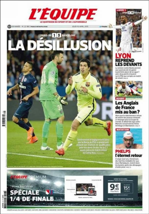 Cover of the newspaper L´Équipe, Thursday 16 April 2015. PSG 1-3 FC Barcelona