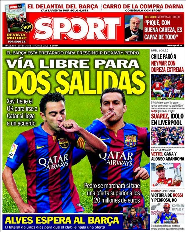 Cover of the newspaper Sport, Monday 30 March 2015. The Barça is prepared to do without Xavi and Pedro. Xavi has the OK to go to Qatar if it arrives to an agreement. Pedro will leave if it brings an upper offer to the 20 million euros.