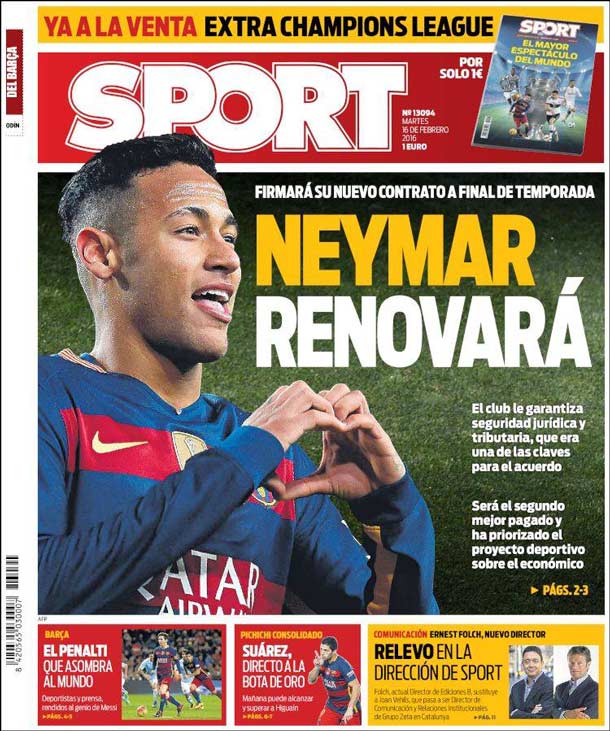 Cover of the newspaper Sport, Tuesday 16 February 2016. It will sign his agreement to final of season. The club guarantees him juridical security and tributaria, that was one of the keys for the agreement. It will be the better second paid and has prioritised the sportive project on the economic.