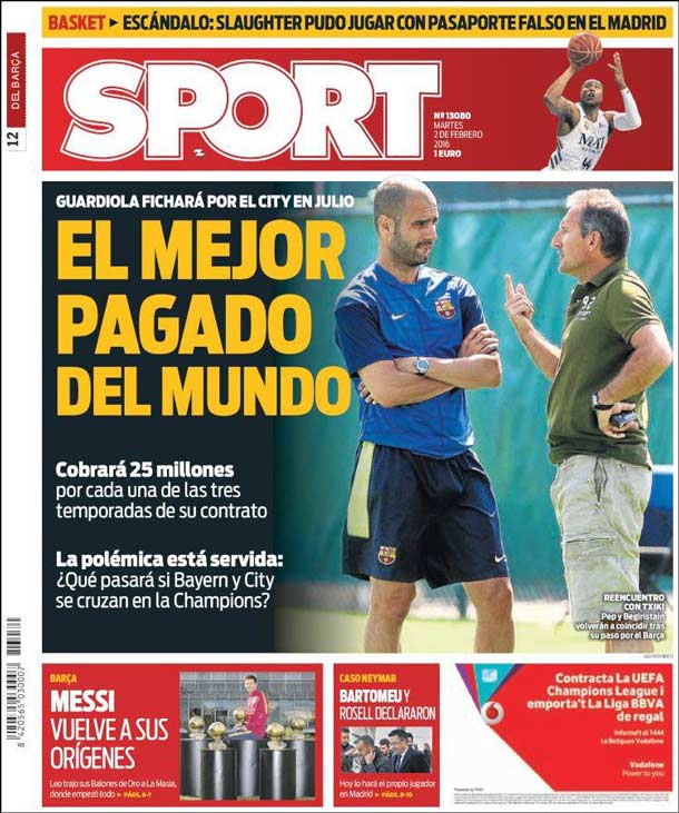 Cover of the newspaper Sport, Tuesday 2 February 2016. Guardiola fichará By the City in July. It will earn 25 millions by each one of the three seasons of his agreement. The controversy is served: What will happen if Bayern and City cross in the Champions?