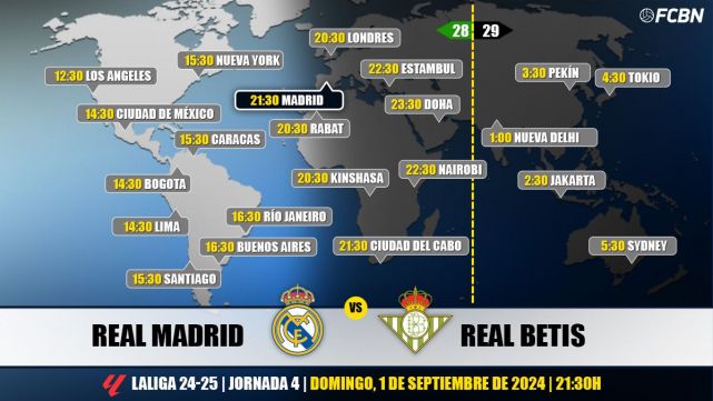 Real Madrid and Betis face each other this Sunday, September 1, starting at 9:30 p.m. (3:30 PM CEST) at the Santiago Bernabéu stadium (Madrid). The match corresponds to matchday 3 of LaLiga EA SPORTS 2024-2025 and pits Real Madrid coached by Carlo Ancelotti against Betis coached by Manuel Pellegrini. Below, we review the schedules and where to watch this football match on TV.