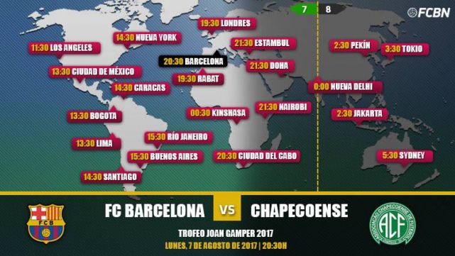 In Sudamérica, Centroamérica, Caribbean, Mexico and Brazil, the Gamper 2017 Barcelona against Chapecoense can see live in the following channels and schedules: