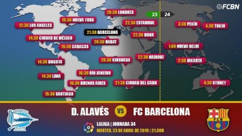 When and where see the party Alavés-FC Barcelona? We review the international guide with the schedules and the channels of television that broadcast in direct and on-line the day 34 of LaLiga Santander 2018-2019. In Spain, can see the party the Tuesday 23 April to the 21:30 hours