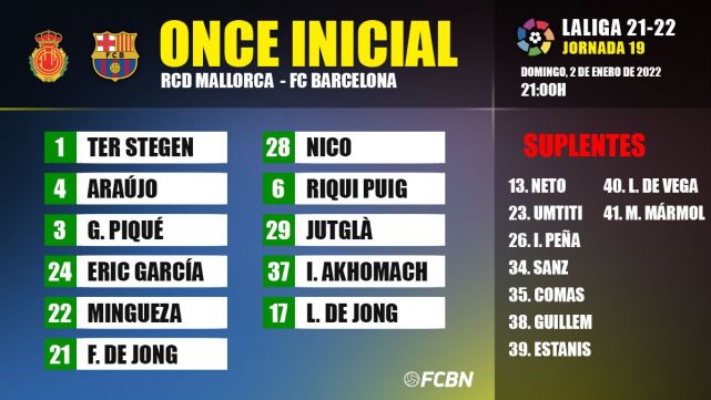 A FC Barcelona plagado of drops by injuries and coronavirus, visits the stadium Are Moix this Sunday from the 21:00 hours to confront to the Mallorca in the corresponding duel to the nineteenth day of LaLiga Santander. It treats of the first party of the ones of Xavi Hernández in this 2021 and a clash of vital importance to follow recortando distances with the teams in the first positions of the table, taking advantage of the 'pricks' of the Real Madrid and Ray Vallecano.