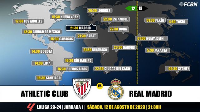 Athletic Club and Real Madrid confront this Saturday 12 August from the 21:30 hours (9:30 PM CEST) in the stadium of Saint Mamés (Bilbao). The meeting corresponds to the day 1 of LaLiga EA SPORTS 2023-2024 and confronts to the Athletic trained by Ernesto Valverde and the Madrid of Carlo Ancelotti. To continuation, review the schedules and where see this football match in TV.