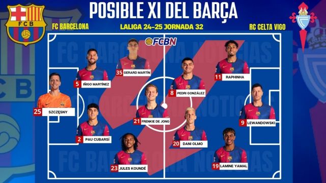 - Starting XI: (25, P) Szczesny; (23) Koundé, (2) Pau Cubarsí, (5) Iñigo Martínez, (35) Gerard Martín; (21) Frenkie de Jong , (8) Pedri, (20) Dani Olmo; (19) Lamine Yamal, (11) Raphinha and (9) Lewandowski.