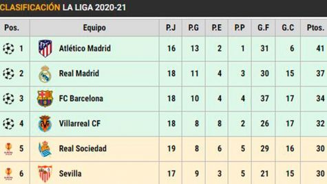 It fits to stand out that Villarreal and Real Sociedad remain fourth and fifth, respectively. The 'Yellow Submarine' has 32 points in 18 duels, whereas the donostiarras add 30 in 19. Both will follow litigating by the Champions League in which right now it is the Barcelona. The culés at last assent in places of League of Champions and his aim now is the second square in which now it is the Madrid.