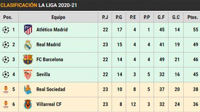 After the equalised, the Atleti distance a point more than Madrid and Barça and already has 55, by the 49 of the merengues and the 46 of the culés. Nevertheless, the madridistas have a meeting more than the rojiblancos and that the blaugrana, by what this difference is not real. By behind it is the Seville, that has a point less than the Catalan team with the same commitments and does not finish of despegar of the places from above.