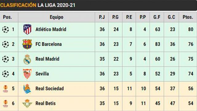 Besides, the Seville also played this Wednesday and surpassed by the minimum to Valencia with a solitary so much of In-Nesyri. The ones of Julen Lopetegui follow fourth with 74 points, but approach a lot to Madrid and Barcelona, that have 75 and 76, respectively. The sevillistas still can be second or third, but officially no longer can be champions, since they are to 6 of an Athletic that has him won the goal-average particular after winning 2-0 in the gone and lose 1-0 in the turn.