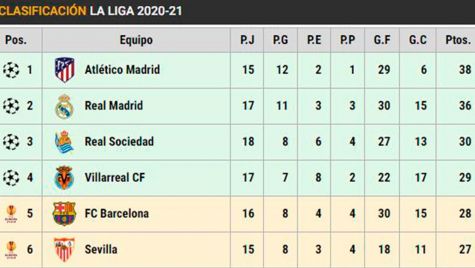 On the other hand, the Seville did not happen of the tie against the Betis in the derbi sevillano and right now remains sixth with 27 points, one less than the Barça and two less than the Villarreal. The 'Yellow Submarine', by the way, won to the Raise the Saturday and is fourth with 29 points, one less than the Real Sociedad, third. The donostiarras failed against Osasuna and empataron to 1, remaining like this far of Madrid and Athletic.