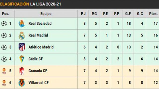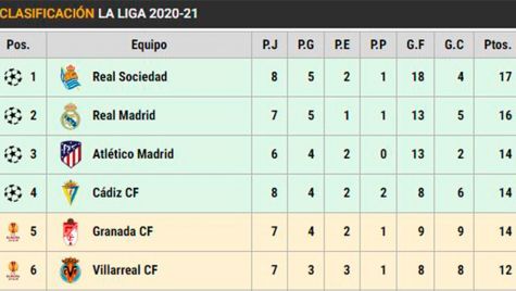 By his part, the Real Madrid won to the Huesca this Saturday gone through 4-1 and finished the day of the Saturday like leader of LaLiga. At the end, the triumph of the Real has ousted them of this position and are in segundp put. The ones of Zinedine Zidane have 16 points, 2 less than the donostiarras, and 2 more than the Athletic of Madrid and the mentioned Cádiz. The 'txuri-urdin' went through on of the Celtic (1-4) with goals of David Silva, Willian José (x2) and Mikel Oyarzabal, that is right now Pichichi of First.