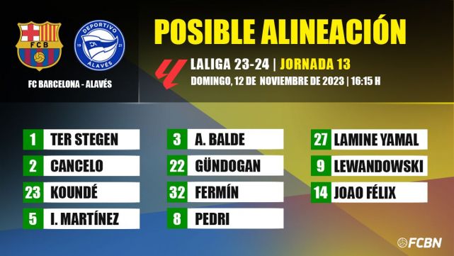 - XI of the FC Barcelona: Ter Stegen; I Cancel, Kounde, Iñigo Martínez, Balde; Gündogan, Fermín, Pedri; Lamine, Lewandowski and Joao Félix.