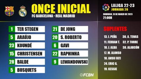 - XI of the FC Barcelona: Ter Stegen; Araújo, Koundé, Christensen, Alejandro Balde; Sergio Busquets, Frenkie Of Jong, S. Roberto, Gavi; Raphinha and Robert Lewandowski.