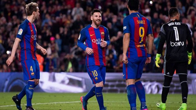 Leo Messi, Luis Suárez and Rakitic celebrate a goal of the Barça in front of Valencia