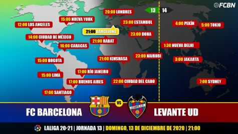 When and where see the match FC Barcelona-Levante? International guide with the schedules and the channels of TV that broadcast in direct and on-line the match of the date 13 of LaLiga Santander 2020-21