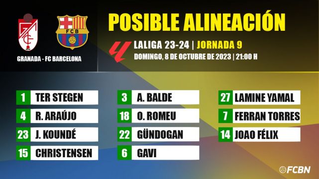 - XI of the FC Barcelona: Ter Stegen; Araujo, Koundé, Christensen, Balde; Romeu, Gündogan, Gavi; Lamine Yamal, Ferran, Joao Félix.