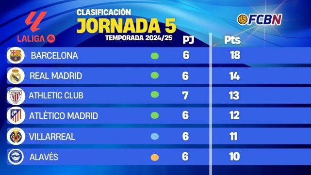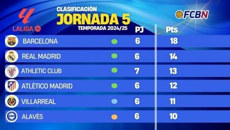 The sixth matchday of LaLiga EA Sports 2024-25 leaves Hansi Flick's Barça as the sole leader of the standings with 18 points, four more than their closest pursuer, Real Madrid, and six behind Atlético de Madrid