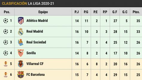 LaLiga Santander 2020-21, in definite, follows very opened when finding us so only in the day 16. This yes, already produce the first clear differences, especially in the leadership and also with the brecha of four existent points between the eighth and the ninth, that already determines to the teams that find in disposal to struggle by Europe and those that, by the contrary, live with more problems.