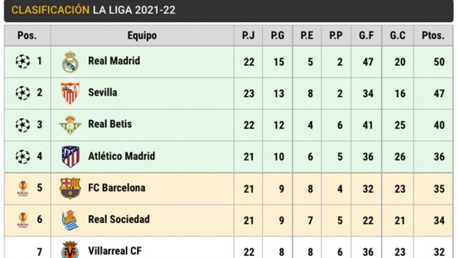 The 'top 10' close it the Real Sociedad (34), Villarreal (32), Athletic (31), Ray Vallecano (31) and Celtic of Vigo (30). In the half of the table of LaLiga finds Valencia (29), Osasuna (29), Espanyol (27), Elche (26), Getafe (25), Granada (24) and Mallorca (23). Finally, in the low zone of the classification are the Cádiz (18), Sportive Alavés (17) and the Raise (11).