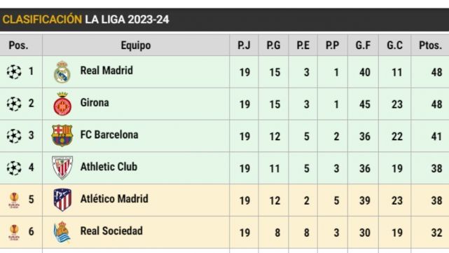 By behind it has remained Athletic Club (38), that insists in colarse in European places, and the Athletic of Madrid (38). The 'top 10' the complete the Real Sociedad (32), Real Betis (28), Getafe (26), Valencia (26) and The Palms (25). In the half of the table, on the other hand, find the Ray Vallecano (23), Oasuna (22), Villarreal (19), Mallorca (18), Alavés (17), Seville (16) and Celtic, that begins the year out of the posicioness of descent. Yes they are, for now, Cádiz (15), Granada (11) and Almería (5).