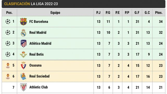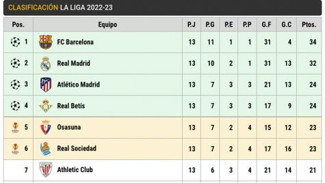 The Barça great 34 points in the table and remains with two more than the Real Madrid, that has 32. The culés go back to play tomorrow, against the Osasuna in The Sadar from the 21:00 hours, to put earth of by half before the World-wide of Qatar. The madridistas, by his part, will play the Thursday against the Cádiz.