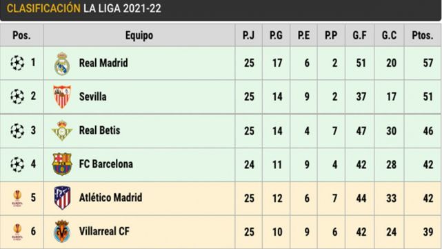 It follows him the Barça and Athletic of Madrid (42) in the fifth position, after his victory against the Osasuna thanks to the goals of Joãor Félix and Luis Suárez. It is a key triumph considering that between week fell by the minimum in front of the Raise. In the sextra square situates the Villarreal, that also has achieved a conclusive victory in front of the Granada.
