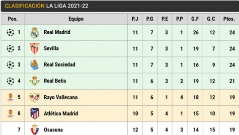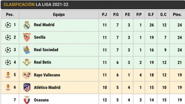 Following with the classification, in the second square is the Seville, with the same 24 points, after winning to the Osasuna (2-0). It follows him the Real Sociedad, with a party less, with 24 units, waiting for the party of this Sunday in front of the Athletic of Bilbao. The Betis closes the zone Champions with 21 units.