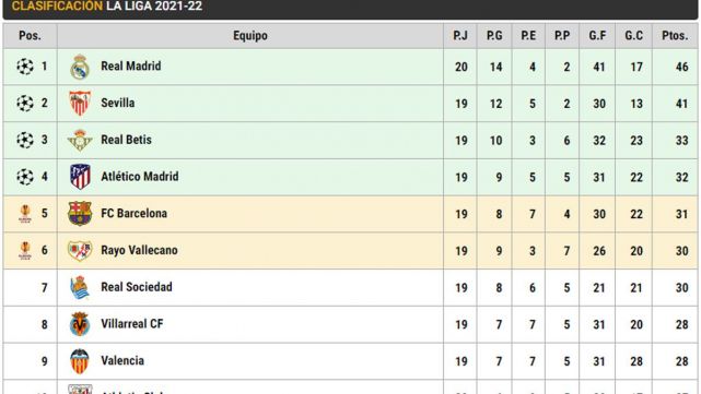 After the term of the day 19, the classification keeps the same in the peak: Real Madrid (46), Seville (41) and Real Betis (33). After his prespectivas victories, the Athletic of Madrid (32) and the FC Barcelona (32) attained scalar positions, fourth and fifth place, respectively. The Ray Vallecano was displaced after falling in front of the colchoneros and now occupies the sixth box with 30 points, same quantity that the Real Sociedad, that went back to puncture (against the Sportive Alavés by 1-1). Villarreal (28), Valencia (28) and Athletic (27), close the top 10.