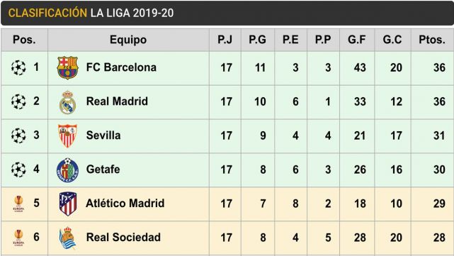 The 36 points of FC Barcleona and Real Madrid do that the advantage with the Seville, third qualifier, was of five although, now yes, with 17 parties contested for all the teams. A point less than the hispalenses has the Getafe, that is fourth qualifier and closes the zone of the table that gives access to the next edition of the Champions League.