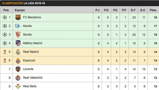 At present, the group of Ernesto Valverde dominates the table with 18 points. Surprisingly, the classified second is the Sportive Alavés that, with a point less than the culés, already have confirmed like the big disclosure of the present season. The team of Abelardo did strong in Balaídos, defeating to the Celtic of Vigo by the minimum.