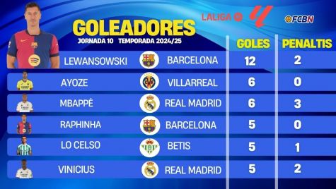 Gio Lo Celso, who also did not play on matchday 10, remains third with 5 goals, the same as Vinicius and Raphinha. The culé winger added an assist against Seville and Real Madrid's '7' scored the first goal for the 'merengues' in Balaídos.