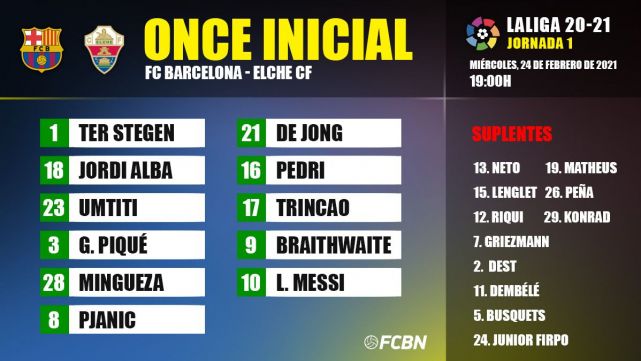 - XI of the FC Barcelona: Ter Stegen; Mingueza, Hammered, Umtiti, Jordi Alba; Pjanic, Of Jong, Pedri; Messi, Trincao and Braithwaite.
